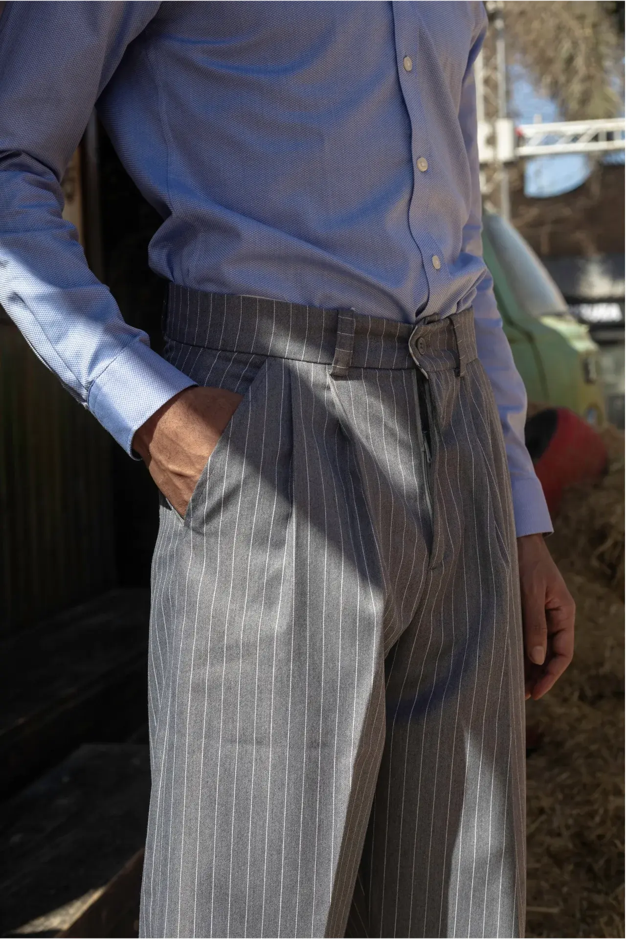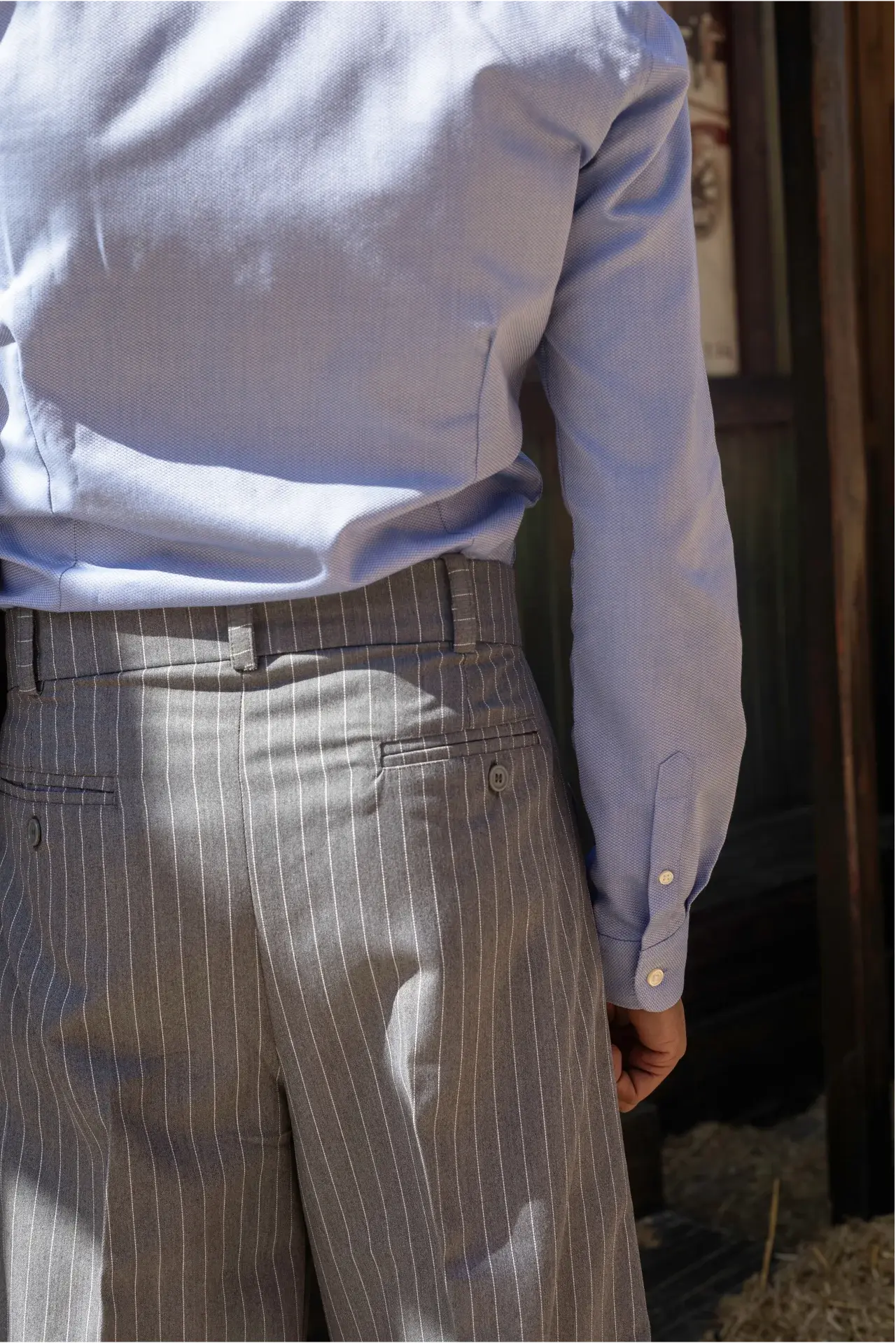 - The Center Crease: To keep the frame elongated and the pinstripes perfectly aligned, always hang your trousers by the waistband or fold them precisely along the center crease using a clamped hanger.